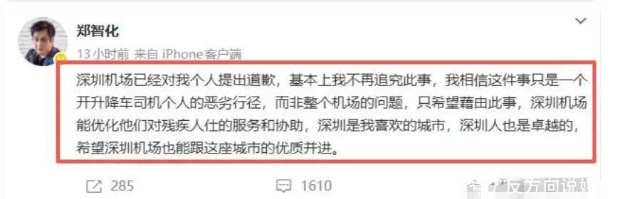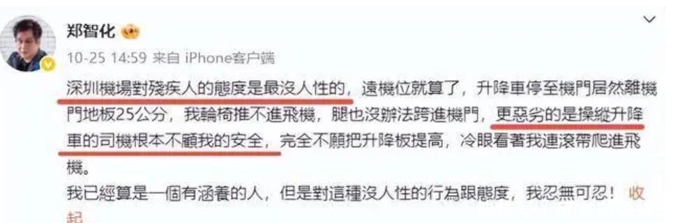 10月27日,随着视频的曝光,他站出来道歉了。这就说明之前在微博说的话不恰当了,因为自己登机不顺的原因,才一时用词过于激烈。在微博里的文字,还夸赞了帮助他推轮椅的小哥,夸对方的服务态度很好,还有详细的说了当天的情况,说搀扶他的腿进机门了。