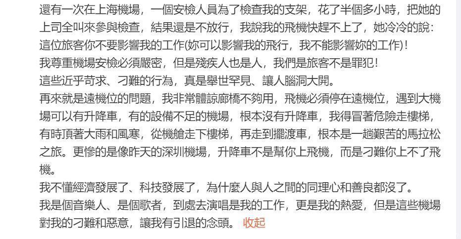 再去看看他之前发的内容,可以发现在10月26日,有一条很长的文字,大概是讲他之前在别的机场遇到的遭遇。他详细的说了几个机场,说之前遇过好几个行为很差的人员,要求把拐杖去托运,那不是叫他不用行走嘛,拐杖就是他的腿。还有的就是检查支架花了很长时间,他说要赶不上飞机了,工作人员态度很差。